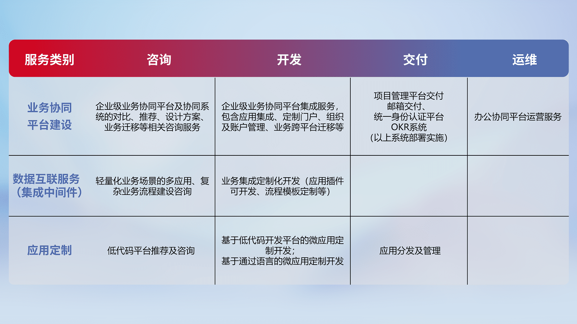 针对钉钉、、、企微、、、IDaas等平台级产品提供产品的规划、、、、方案、、交付、、定制化开发等服务,,实现如统一协同办公、、、、智能客户服务、、、混合会议管理、、智能数据查询、、、等业务场景,,实现数字化转型。。。