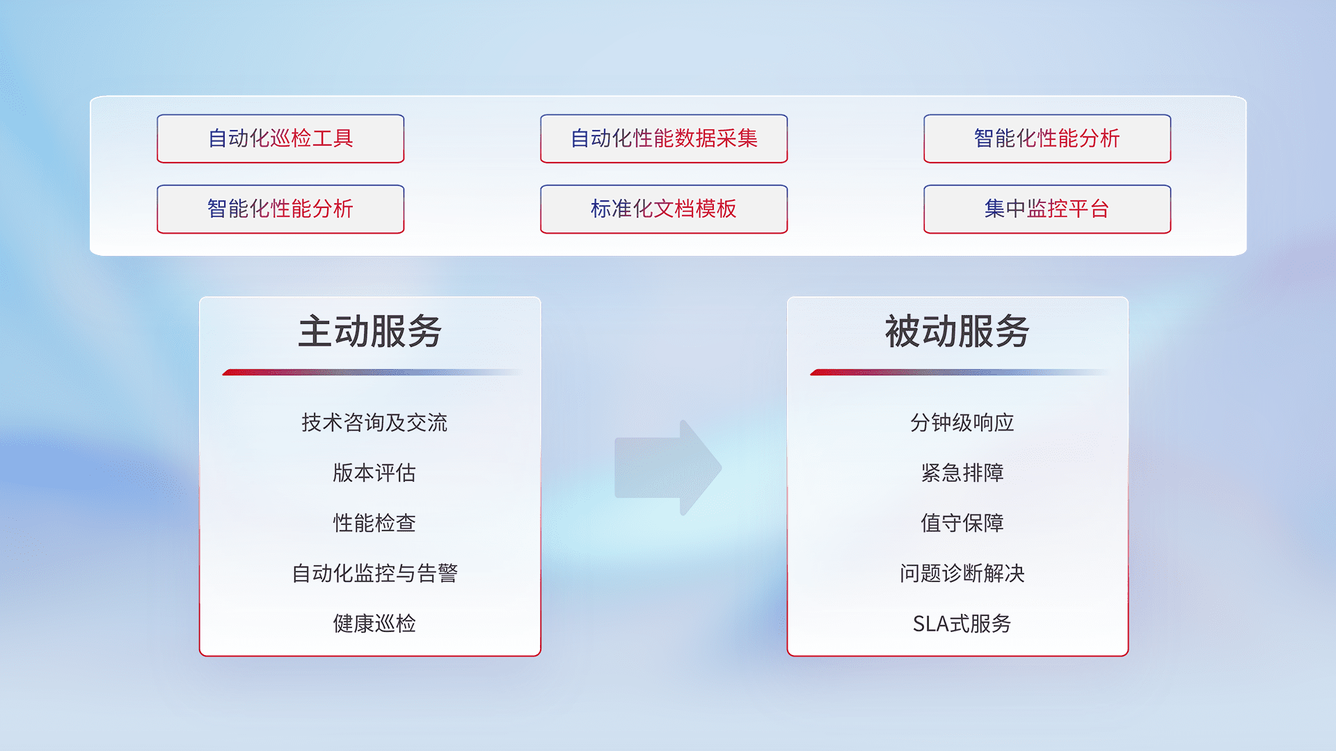 智能化工具和标准化文档,,,保障服务质量,,,提供主动服务(包含技术咨询、、版本评估、、性能检查、、、、自动化监控与告警、、、、健康巡检)和被动服务包含(分钟级响应、、、、紧急排障、、值守保障、、、问题诊断解决、、SLA服务)。。。。